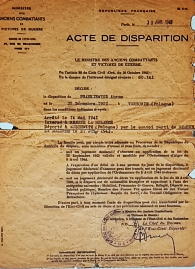 Abraham le père est arrêté le 14 mai 1941 lors de la rafle du billet vert1 après sa convocation à la caserne des Tourelles. Il est incarcéré au camp de Beaune la Rolande2 (Loiret). Il y retrouve un cousin et un oncle de Rachel. Le 28 juin 1942 il est dans le convoi n°5 à destination d’Auschwitz d’où, comme la majorité, il ne reviendra pas.
