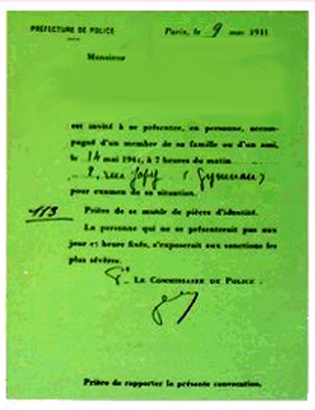 1°) billet vert : convocation par la police française au commissariat proche des juifs étrangers et de leur arrestation le 14 mai 1941. (3500 à 3700 hommes seront ainsi arrêtés).